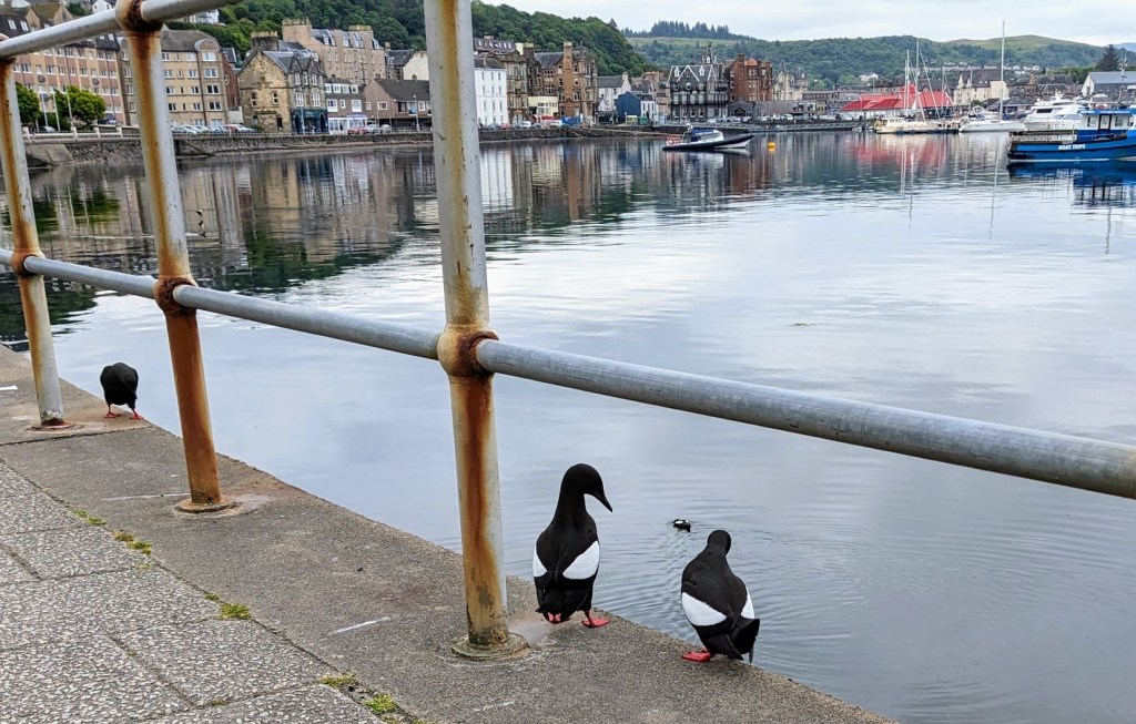 In the bay at Oban we saw a small diving duck with white flashes on its wings. This turned out to be a member of the auk family, a black guillemot. The puffin and razorbill also belong to this group. In summer the black guillemot is the only seabird which is all black with white wing patches. They are quite small ducks, only thirteen inches, and this one was all on its own. “The least sociable duck” according to the book. In the suburban garden of the house where we were staying we saw a pair of west coast hooded crows. They are larger than their east coast cousins, and the grey and black markings were so contrasting as almost to make them look, at a glance, like magpies. This pair were scavenging and strangely enough the female had a white V marking on her right wing so the next morning we were easily able to identify the same pair.